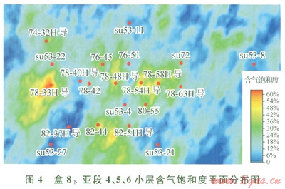 在有效厚度三維模型的基礎上,提取了各小層有效厚度的疊合圖,形成盒8下亞段4、5、6小層的有效厚度疊合圖(圖6),從平面上反映r有效儲層的分布范圍和趨勢。通過地質建模預測盒8下亞段4、5、6小層累計有效砂巖厚度為0~22m,基本呈連片分布,與沉積特征相一致,該區(qū)中部、南部及西部的78-33H導井區(qū)有效厚度最大,達到20m左右;低值區(qū)主要分布在蘇53-7井東部、82-37H導井區(qū)、蘇53-8井區(qū)附近等,有效厚度小于3m,反映了區(qū)內氣藏的分布規(guī)律。