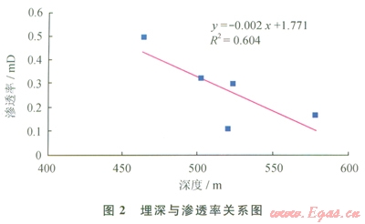 區(qū)內(nèi)比德向斜注入壓降法試井滲透率為0.1074~0.50016mD(表1),平均為0.279688mD,為中滲透率煤儲層;在層域上,滲透率和埋深的相關(guān)關(guān)系較好,滲透率隨埋深增大而減小(圖2)。三塘向斜織3井16號煤層及珠藏向斜織2井23號煤層儲層滲透率分別為0.000514mD、0.000164mD,均屬低滲透率煤儲層。