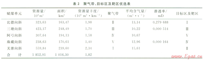 煤層氣勘探目標(biāo)區(qū)應(yīng)是蘊(yùn)藏有一定資源量、并具有煤層氣富集高產(chǎn)潛勢的地區(qū)。因此,煤儲層含氣量和滲透率是應(yīng)優(yōu)先考慮的兩個(gè)關(guān)鍵控氣因素,面積和資源豐度(兩者之積為煤層氣資源量)對目標(biāo)區(qū)的經(jīng)濟(jì)價(jià)值也具有決定性意義。按照遞階優(yōu)選法,按聚氣帶®目標(biāo)區(qū)®靶區(qū)的遞階層次進(jìn)行選區(qū)評價(jià)和優(yōu)選,優(yōu)選的關(guān)鍵主要在于煤儲層面積、含氣量、儲層滲透率和臨儲壓力比5個(gè)要素[7,19-21]。
