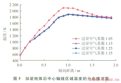 增加鈍體可以有效增加燃燒器出口的回流區(qū)域,使燃燒產(chǎn)生的高溫炯?xì)饣亓?,增加燃燒的穩(wěn)定性,提高燃燒效率,同時(shí)還能有效提高爐膛溫度的均勻性。圖5為在燃燒器出口加裝鈍體后的中心軸線(xiàn)區(qū)域溫度分布情況,圖6為燃燒爐膛溫度分布云圖。