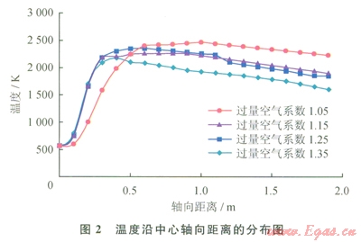 在過(guò)量空氣系數(shù)(d)分別為1.05、1.15、1.25和1.35這4種工況下,爐膛燃燒區(qū)域溫度沿中心軸向距離(X)為0~2.0m(取燃燒器擴(kuò)散噴口出Vl為X=0的位置)的分布如圖2所示。