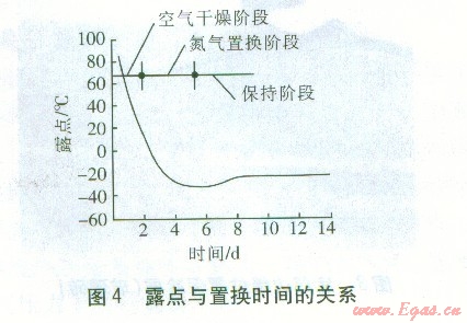 實(shí)測(cè)結(jié)果能否真實(shí)地反映實(shí)際情況主要取決于置換時(shí)間。只要置換時(shí)問足夠長(zhǎng),氮?dú)饩湍軡B透到任何位置,使空氣與氮?dú)獬浞只旌隙恢脫Q。露點(diǎn)與置換時(shí)間的關(guān)系曲線見圖4。然而對(duì)于一個(gè)工程來說,置換時(shí)間與成本緊密相關(guān),不能無限地追求質(zhì)量而忽略成本。