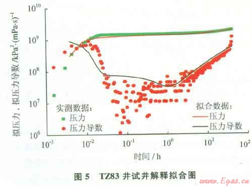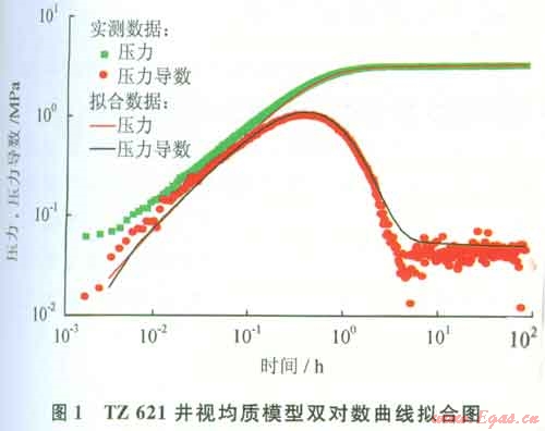 如TZ621井,4851~4885m井段的儲(chǔ)層測(cè)井解釋孔隙度為2.66%,巖性為生屑砂屑灰?guī)r,針狀溶孔及小型溶蝕孔洞發(fā)育,主要發(fā)育Ⅱ、Ⅲ類儲(chǔ)層,儲(chǔ)滲綜合評(píng)價(jià)為孔洞型。試油期間,開井流動(dòng)曲線近似一條水平直線,呈干層特征;初關(guān)井壓力恢復(fù)較快,表明地層滲透性較好(圖1)。壓裂后,用4.9mm油嘴生產(chǎn),折合日產(chǎn)油103.87m3,折合日產(chǎn)氣47320m3,效果顯著。試井解釋表現(xiàn)出典型的均質(zhì)地層特征。由于廣泛發(fā)育洞穴,且洞穴內(nèi)巖石充填較少,所以此類儲(chǔ)層的滲流條件非常好,試井解釋滲透率為270mD,初期產(chǎn)能高,但穩(wěn)產(chǎn)條件取決于洞穴的彈性空問大小以及與洞穴相連的儲(chǔ)集體儲(chǔ)滲能力的大小。該井自2004年12月8日到2011年3月10日關(guān)井前,累計(jì)產(chǎn)油9.9×104t,累計(jì)產(chǎn)氣4400×104m3。