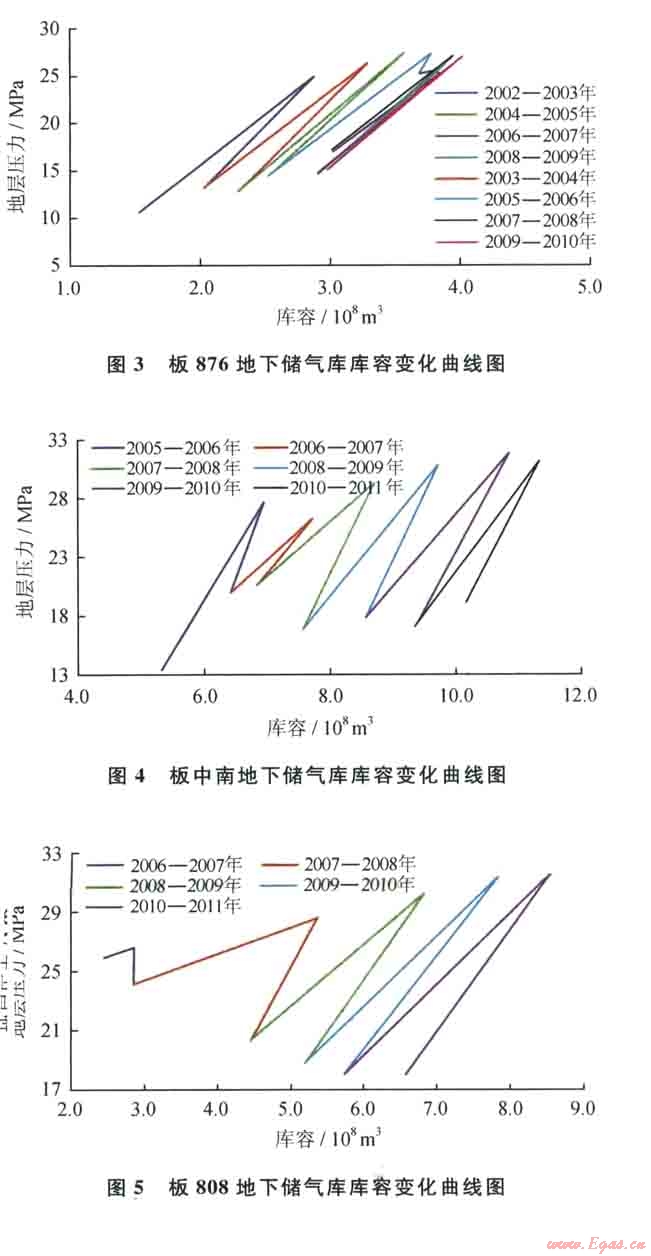 1)地下儲(chǔ)氣庫(kù)庫(kù)容量呈現(xiàn)逐漸增加的趨勢(shì),并最終趨于最大庫(kù)容量。以注氣期結(jié)束時(shí)的庫(kù)容量為地下儲(chǔ)氣庫(kù)的當(dāng)期庫(kù)容量,采氣期結(jié)束時(shí)的庫(kù)容量為地下儲(chǔ)氣庫(kù)的當(dāng)期墊氣量,庫(kù)容量與墊氣量之差即為當(dāng)期工作氣量(采氣量)。從地下儲(chǔ)氣庫(kù)的實(shí)際庫(kù)容量變化曲線看(圖3~7),隨著地下儲(chǔ)氣庫(kù)注采周期的增加,庫(kù)容曲線普遍右移,地下儲(chǔ)氣庫(kù)庫(kù)容明顯增大,而且注采周期越多,庫(kù)容增加愈多。板876地下儲(chǔ)氣庫(kù)運(yùn)行5~8個(gè)注采周期時(shí),庫(kù)容變化曲線基本重疊,表明地下儲(chǔ)氣庫(kù)已達(dá)到最大庫(kù)容量。由此也說(shuō)明地下儲(chǔ)氣庫(kù)達(dá)容是一個(gè)長(zhǎng)期的過(guò)程。從已建地下儲(chǔ)氣庫(kù)的達(dá)容特征看,水淹型地下儲(chǔ)氣庫(kù)的達(dá)容周期超過(guò)5年。