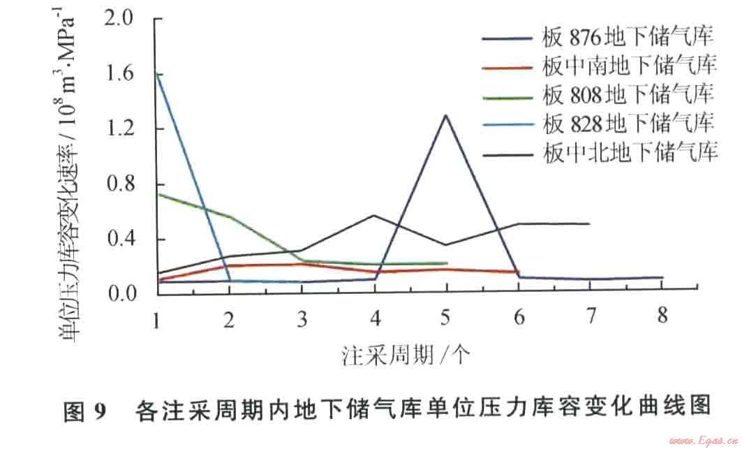 盡管地下儲(chǔ)氣庫(kù)的達(dá)容過(guò)程具有前快后慢的特點(diǎn),但地下儲(chǔ)氣庫(kù)從第2注采周期開(kāi)始,單位壓力下庫(kù)容的變化量即彈性庫(kù)容率卻基本維持在一個(gè)穩(wěn)定值,盡管不同地下儲(chǔ)氣庫(kù)的該數(shù)值不同,但同一地下儲(chǔ)氣庫(kù)彈性庫(kù)容率基本穩(wěn)定的規(guī)律相同。地下儲(chǔ)氣庫(kù)單位壓力庫(kù)容變化曲線圖9所示。同理,在圖3~7中每個(gè)地下儲(chǔ)氣庫(kù)不同注采周期的曲線斜率也基本相同,反映每一個(gè)地下儲(chǔ)氣庫(kù)在壓力運(yùn)行區(qū)間內(nèi)單位壓力變化所波及的有效孔隙空間容積基本不變。由此推測(cè),實(shí)際上地下儲(chǔ)氣庫(kù)內(nèi)的氣水與地下儲(chǔ)氣庫(kù)外部的弱水體總體上組成了同一氣水系統(tǒng),類似于定容氣水系統(tǒng)的特征。以板876地下儲(chǔ)氣庫(kù)為例,在地下儲(chǔ)氣庫(kù)生產(chǎn)運(yùn)行的8個(gè)注采周期中,除第5注采周期生產(chǎn)管理因素外,其余各注采周期的彈性庫(kù)容率基本相同,無(wú)論庫(kù)容增速快慢或庫(kù)容量大小變化,但彈性庫(kù)容率卻基本不變。但板中北地下儲(chǔ)氣庫(kù)卻是個(gè)特例,其具有較強(qiáng)的邊部水體,在地下儲(chǔ)氣庫(kù)生產(chǎn)運(yùn)行的7個(gè)注采周期中,隨著注采周期增加庫(kù)容量逐漸增大,同期彈性庫(kù)容率也逐漸增大,反映了強(qiáng)邊水地下儲(chǔ)氣庫(kù)的庫(kù)容率變化規(guī)律。