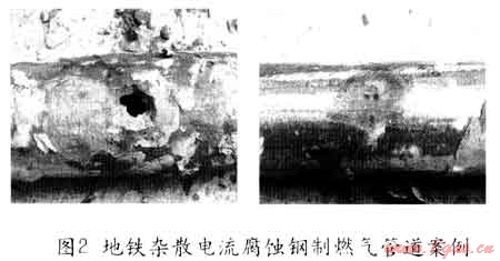 例如,香港曾閃地鐵雜散電流引起煤氣管道腐蝕穿孔,而造成煤’(泄漏事故;北京、天津地鐵中的雜散電流已造成隧道內(nèi)水管腐蝕穿孔;據(jù)東北輸油管理局統(tǒng)計(jì),東北地區(qū)共有長(zhǎng)輸油管道約2000km,其中80%的腐蝕穿孔事故來(lái)自雜散電流的影響。圖2為某城市鋼制燃?xì)夤艿朗艿罔F雜散電流腐蝕后穿孔的圖片,地鐵雜散電流對(duì)金屬管道的強(qiáng)烈腐蝕作用可見(jiàn)一斑。