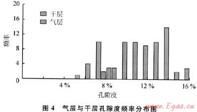 有效孔隙度下限確定有兩種方法:①根據(jù)壓汞資料,分析中值壓力與孔隙度的關(guān)系,當(dāng)孔隙度小于某一值時(shí),中值壓力迅速增大,說明當(dāng)孔隙度小于該值時(shí),汞基本壓不進(jìn),即這部分孔隙基本為無效孔隙[6~7](圖3),利用該法確定的研究區(qū)有效孔隙度下限為7%;②統(tǒng)計(jì)試油產(chǎn)層段與干層段孔隙度的分布特征來確定(圖4)。由圖3可知,干層和氣層孔隙度的分界線在7%左右,可見該區(qū)儲(chǔ)層有效孔隙度取7%比較合適。