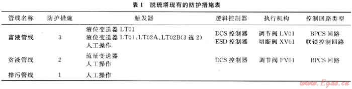 以某天然氣凈化廠的脫硫塔為例(該塔屬于重點高壓設備)。含硫天然氣在塔內(nèi)由下至上,在常溫高壓條件下脫除其中的硫化氫后從塔頂排出,脫硫溶劑貧液自塔頂往下流,吸收含硫天然氣中的硫化氫后從塔底排出,進入低壓系統(tǒng)再生。為保證高壓介質(zhì)不竄入低壓系統(tǒng),除設置脫硫塔液位調(diào)節(jié)回路外,另設置了安全聯(lián)鎖控制回路,作為重要的防護層。該裝置現(xiàn)有防護措施如表1所示。