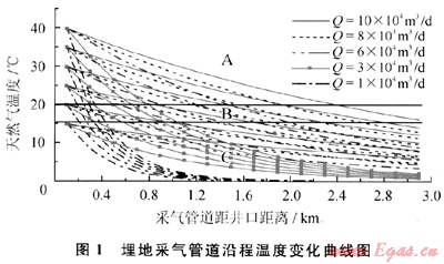 天然氣水合物防治效果主要受管輸壓力、溫度、流量和距離等因素影響。為此,根據(jù)埋地管道散熱損失情況,模擬計(jì)算管道沿程溫度變化情況,各參數(shù)范圍確定為:氣井產(chǎn)量為(1~10)×104m3/d;井口溫度為15~40℃;運(yùn)行壓力為7.0MPa;管道規(guī)格為Φ76mm×4mm;采氣管道長度為0~3.0km;管道保溫材料為40mm硅酸巖棉殼;管道埋深為1.8m。