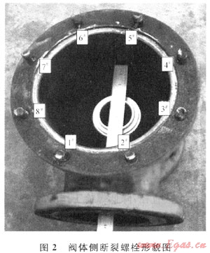 閥蓋上的8個螺栓光孔均發(fā)生了月牙形磨損或擠壓變形成為橢圓形,其中橢圓長軸沿徑中心。對光孔長軸和短軸進行測量并計算橢圓度,發(fā)現(xiàn)1#、2#、3#、8#光孔比4#、5#、6#、7#光孔橢圓度大(光孔編號與螺栓編號一一對應)。