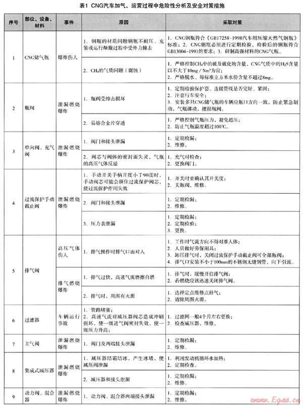 2.6 CNG汽車加氣、運(yùn)營(yíng)過(guò)程中危險(xiǎn)性分析見表1。
