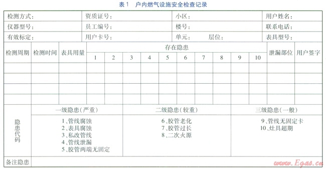 鑒于以上思路,以戶內(nèi)安檢崗位為例,在戶內(nèi)發(fā)生爆炸、爆燃等事故后,相關(guān)部門首先要對(duì)燃?xì)膺\(yùn)營部門是否按國家標(biāo)準(zhǔn)執(zhí)行檢查,是否落實(shí)檢查工作等問題進(jìn)行核實(shí),那么核實(shí)的依據(jù)就是戶內(nèi)燃?xì)庠O(shè)施安全檢查記錄。我們通常的記錄只有檢查人、地點(diǎn)、時(shí)間、存在隱患、處理結(jié)果、處理人及用戶簽字等項(xiàng)目,看起來比較完善,但就筆者來看還是差強(qiáng)人意,只是提供了一些表面證據(jù),沒有體現(xiàn)出更深層面的法律效應(yīng)。例如:我們的員工有沒有檢查資質(zhì),有沒有使用專業(yè)的檢測設(shè)備,檢測設(shè)備是否按時(shí)標(biāo)定,設(shè)置在戶內(nèi)的燃?xì)庠O(shè)施有沒有超出使用年限,燃?xì)庠O(shè)施設(shè)置是否保持原始設(shè)計(jì)等,都沒有在記錄中體現(xiàn)。燃?xì)膺\(yùn)營管理者應(yīng)該對(duì)其進(jìn)行完善,并在記錄中直觀體現(xiàn),而這幾項(xiàng)問題想要在記錄中得到體現(xiàn)就需要運(yùn)營企業(yè)投入資金來支撐,要對(duì)職工進(jìn)行培訓(xùn)取得資質(zhì),購入檢測設(shè)備并按時(shí)標(biāo)定。而燃?xì)庠O(shè)施設(shè)置是否保持原始設(shè)計(jì)的問題,筆者認(rèn)為應(yīng)該列入設(shè)備檔案管理,即:對(duì)戶內(nèi)安裝的燃?xì)庠O(shè)施形成影像記錄,儲(chǔ)存在計(jì)算機(jī)內(nèi),可隨時(shí)調(diào)閱來及時(shí)掌握燃?xì)庥脩羰欠襁M(jìn)行過更改。戶內(nèi)燃?xì)庠O(shè)施安全檢查記錄見表1。