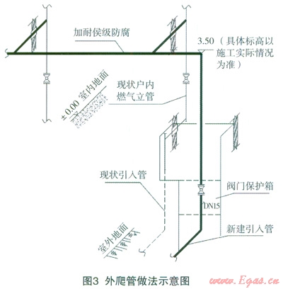 針對老舊小區(qū),戶內(nèi)立管往往位于居民室內(nèi)裝修或者包封內(nèi),改造難度較大或者不存在改造的可能性,可采用將引入管改至與首層立管相接處的方式,而不改造原有燃氣立管。如果存在地上引入口被占壓的情況,而且占壓物不便于拆除時,可采用樓前管采用外爬墻方式敷設(shè),外爬管在樓房燃氣立管所在側(cè)爬至二層樓的0.5m高處,分別與現(xiàn)狀燃氣立管相接,如圖3所示。
