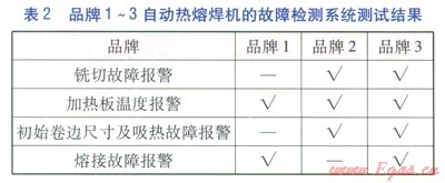 品牌l、2自動(dòng)熱熔焊機(jī)的故障檢測(cè)系統(tǒng)不完整,即使焊接參數(shù)不符合標(biāo)準(zhǔn)也可允許焊接繼續(xù)進(jìn)行。品牌l3自動(dòng)熱熔焊機(jī)的故障檢測(cè)系統(tǒng)測(cè)試結(jié)果見(jiàn)表2。由表2可知,品牌12自動(dòng)熱熔焊機(jī)未對(duì)表2中列舉的所有故障作出報(bào)警提示。
