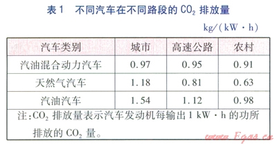 表1表明:a.在城市內(nèi)行駛,汽油混合動力汽車是最清潔的。b.在農(nóng)村地區(qū)、高速公路上行駛時(shí)(車速快,發(fā)動機(jī)工作),在二氧化碳減排方面,純天然氣汽車優(yōu)于汽油汽車、汽油混合動力汽車。