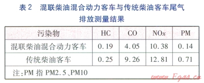 中國汽車技術(shù)研究中心與武漢理工大學(xué)等單位采用同規(guī)格的一輛混聯(lián)柴油混合動力客車與一輛傳統(tǒng)柴油客車,在北京通州區(qū)交通部公路試驗(yàn)場內(nèi),參照《重型混合動力電動汽車能量消耗量試驗(yàn)方法》(GB/T l9754—2005)及美國SAE—J2711標(biāo)準(zhǔn)《混合動力重型車輛排放性能測試》進(jìn)行了指定工況下的混合動力汽車場地排放測試,結(jié)果見表2。