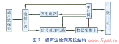 超聲波的檢測系統(tǒng)結(jié)構(gòu)見圖3,超聲波檢測系統(tǒng)主要以單片機為控制核心,數(shù)據(jù)的采集、處理、顯示由微機完成。單片機控制發(fā)射電路發(fā)出窄脈沖,激勵超聲波探頭發(fā)出超聲波,并隨之切換開關(guān),切換到接收回路。然后啟動數(shù)據(jù)采集卡進行數(shù)據(jù)采集,經(jīng)過微機處理后顯示分析結(jié)果。超聲波檢測技術(shù)測量精度高,能分辨管內(nèi)壁和外壁腐蝕,不受管材約束,能夠測量漸變腐蝕。但該檢測技術(shù)存在檢測盲區(qū),且只能對光潔表面檢測,還需要耦合劑。