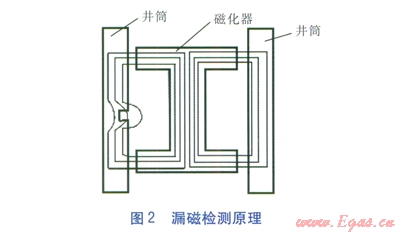 漏磁檢測系統(tǒng)由電源、磁化裝置、檢測探頭、A/D模塊、計算機等組成。井筒壁被磁化裝置磁化后發(fā)出電磁信號,該信號被檢測探頭檢出,再由A/D模塊采集,最后在計算機中顯示分析結(jié)果。該檢測技術(shù)對突變?nèi)毕菝舾?,無檢測盲區(qū),能對管壁進行全面檢測,對表面光潔度要求低,不需要耦合劑。缺點是測量精度低,受管材限制,不能夠測量漸變腐蝕。