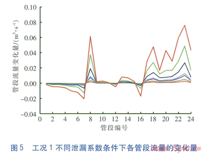 對上述數(shù)據(jù)進行處理,求得工況l不同泄漏系數(shù)條件下各管段流量相對于正常工況流量的變化量,即正常工況時管段的流量減去泄漏工況時管段的流量,見圖5。