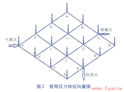 管網(wǎng)具有不同的運行工況時,如單氣源點或者多氣源點管網(wǎng)以及氣源點位置不同,單負荷點或者多負荷點以及負荷點位置不同,管網(wǎng)的壓力特征向量圖都是不同的,管網(wǎng)不同的環(huán)、不同的位置出現(xiàn)泄漏時對壓力特征向量的影響更是不同。在大量模擬數(shù)據(jù)以及實驗數(shù)據(jù)的基礎(chǔ)上,對各種不同工況下的泄漏進行分析,可以依據(jù)壓力特征向量圖對其是否發(fā)生泄漏以及泄漏點位置進行判定[2]。