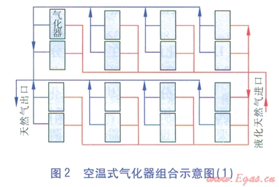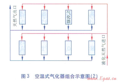 空溫式氣化器的臺數(shù)和氣化量,可跟據工程建設規(guī)模和用戶的要求綜合確定??諟厥綒饣鹘M合示意見圖2、3。