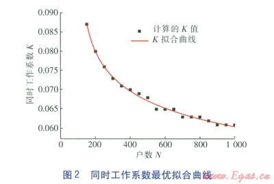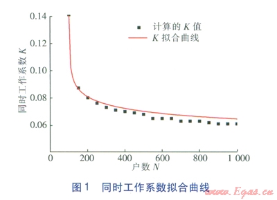 此式仍然滿足同時工作系數(shù)的一般規(guī)律,而且加冪運(yùn)算使得K隨Ⅳ的變化而變化的敏感性提高。當(dāng)置信區(qū)間P較小時,計算誤差對整個運(yùn)算的影響逐漸減小,故而造成的波動也越來越小。針對此地區(qū)的同時工作系數(shù)在置信區(qū)間P=[0.99,1)時,將計算出來的離散數(shù)據(jù)擬合成曲線的函數(shù)關(guān)系,將表1中的數(shù)據(jù)作為依據(jù)進(jìn)行擬合,得到戶數(shù)與同時工作系數(shù)的擬合結(jié)果,見圖1。