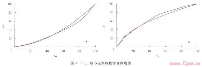 繪制擬合曲線和線性化補(bǔ)償反函數(shù)曲線(圖3)。二級(jí)節(jié)流閥開(kāi)度(ST)與流量系數(shù)(CV)存在圖3-a藍(lán)色曲線所示關(guān)系,曲線表明兩者關(guān)系非線性比較嚴(yán)重,不利于流量均勻準(zhǔn)確控制,必須進(jìn)行線性化,以達(dá)到智能線性解耦控制。