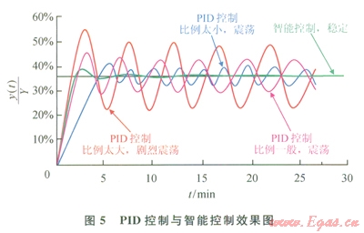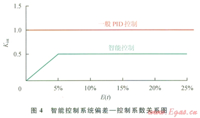 可見(jiàn),采用智能控制,可使偏差快速穩(wěn)定收斂,當(dāng)[å|e(t)|/n]/Yset≥5%時(shí),采用固定比例控制,當(dāng)[å|e(t)|/n]/Yset≤5%時(shí),采用一定時(shí)間(大約0.5個(gè)波動(dòng)周期)相對(duì)偏差絕對(duì)值的均值(10/Yset)[ å|e(t)|/n]作為改變控制量的隨機(jī)變動(dòng)系數(shù),智能系數(shù)Kint,與E(t)在5%以下時(shí)呈線性遞增關(guān)系,控制量u(t)與E(t)呈非線性遞增關(guān)系。