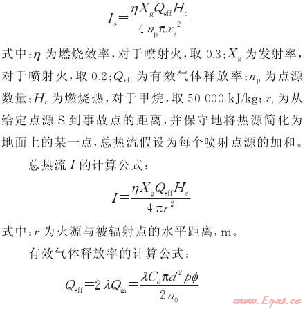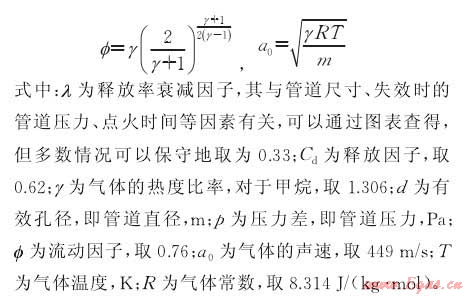 天然氣管道的泄漏事故總體分為兩種。即噴射火和爆炸,以某城市燃?xì)夤艿罏槔謩e計(jì)算兩種情況下管道的泄漏影響范圍,其中燃燒使用ASME推薦公式計(jì)算,而擴(kuò)散則應(yīng)用高斯模型計(jì)算。相關(guān)參數(shù):管道直徑1m,輸氣壓力分別為3.5MPa和4.0MPa,假設(shè)事故原因?yàn)榈谌狡茐模蠊浅霈F(xiàn)15cm孔洞。
