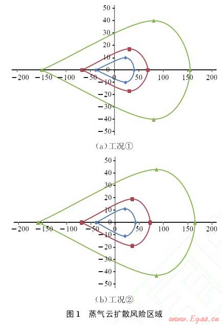 2,用時(shí)分別為27s和1162.3s,低于該熱流值時(shí)人員不會死亡、木質(zhì)結(jié)構(gòu)不會損壞。為此,危險(xiǎn)輻射強(qiáng)度取15.77kW/m2,兩種工況下噴射火的危險(xiǎn)半徑分別為45m和50m。
