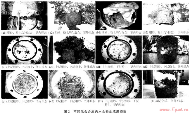 上述各組實驗內的水量均為100g,介質類型不同引起其內水合物最終生成形態(tài)差異明顯,說明介質內的水分分布狀態(tài)對水合物生成形態(tài)影響明顯。均勻混合介質中摻入粉土的粗砂、細砂顆粒較粗,等質量混合后對粉土持水作用影響不明顯,實驗中甲烷氣體從反應釜上部充入,介質上界面水分與氣體接觸充分,水合物形成于介質上界面,因而均勻混合介質內水合物最終生成相態(tài)基本類似(圖2中a、b)。層狀介質類型可明顯影響其內水合物生成形態(tài),原因可能是不同單一介質對水分產生的吸持力差別大(粉土>細砂>粗砂),介質搭配為層狀結構后,水分在層狀介質內的分布狀態(tài)及水分子在介質表面的吸附排列存在較大差異,因此層狀介質內水合物初級結構生成順序明顯不同,水合物最終生成形態(tài)也就存在較大差異。粗砂、細砂層狀介質內實驗前的水含量較高,介質持水能力較弱,水合物類似在過飽和介質內形成,形成較困難。另外,這些差異也反映出多孔介質內水合物形成機制非常復雜,此方面還需要做大量深入研究。