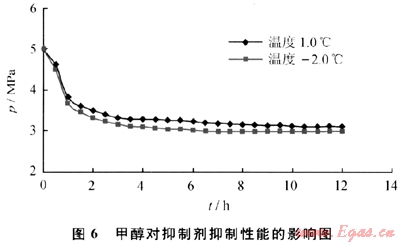 配制甲醇在純水溶液中的濃度為20%,抑制劑濃度為1.5%,體系壓力恒定在5.0MPa,測(cè)定時(shí)體系壓力、時(shí)間的變化關(guān)系如圖6所示。