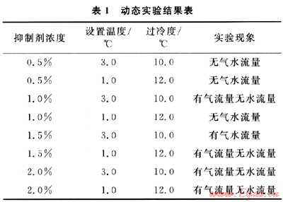 為了更好地模擬現(xiàn)場(chǎng)的真實(shí)情況,評(píng)價(jià)抑制劑的抑制性能,為現(xiàn)場(chǎng)提供正確指導(dǎo),模擬井筒和長(zhǎng)輸管線(xiàn)中的水合物堵塞情況,進(jìn)行了不同過(guò)冷度、不同抑制劑濃度下的流動(dòng)實(shí)驗(yàn),研究不同濃度的抑制劑的抑制效果。實(shí)驗(yàn)共測(cè)定了4個(gè)濃度、2個(gè)過(guò)冷度下的水合物堵塞情況,其結(jié)果如表1所示。