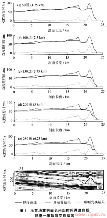 從幾何特征出發(fā),可以利用含礁體地層的厚度參數(shù)來刻畫礁體的分布。這需要在地震數(shù)據(jù)體上準(zhǔn)確地拾取含礁體地層的頂、底界面,然后計(jì)算出其間的厚度,據(jù)此推斷礁體的分布,其中厚度較大的區(qū)域是礁體的潛在分布區(qū)域。該方法原理簡(jiǎn)單、易于操作,是定性判斷礁體分布的有效方法;其不足之處足只能大致圈定可能的礁體發(fā)育區(qū)域,不能定量地分離出各個(gè)孤立礁體的位置及分布范圍。筆者根據(jù)生物礁沉積厚度較同期非礁相地層大這一簡(jiǎn)單的沉積地質(zhì)學(xué)原理。引入數(shù)學(xué)形態(tài)學(xué)中的頂帽變換方法,實(shí)現(xiàn)礁體分布的自動(dòng)探測(cè)。