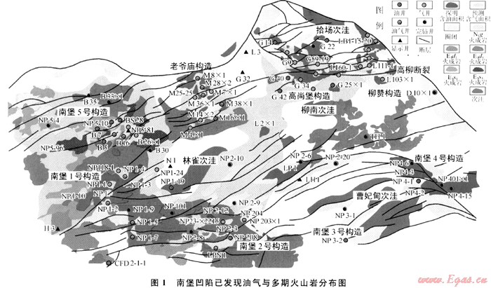 南堡凹陷源巖樣品熱模擬和三維生烴動力學(xué)模擬結(jié)果都顯示,主力烴源巖古近系沙三段和部分東三段的熱演化程度大面積處于低成熟和成熟階段,僅E3s3在局部深洼或局部火山活動地區(qū)高溫區(qū)進入生氣階段,尚未達到大量生氣階段,導(dǎo)致南堡凹陷已發(fā)現(xiàn)油氣分布呈現(xiàn)油氣共生、大面積含油和局部富氣的特點,其中天然氣富集區(qū)主要位于深洼區(qū)斜坡部位和火山巖分布區(qū)(圖1和圖5)。如在林雀次凹北部(預(yù)測其烴源巖生氣強度為32×108m3/km2)廟南斜坡區(qū)發(fā)現(xiàn)的廟4×1和廟16×1氣藏、北堡斜坡區(qū)發(fā)現(xiàn)的南堡5-10和南堡5-81油氣藏都與氣源巖成熟度和火山巖分布密切關(guān)。南堡4號構(gòu)造帶目前尚未發(fā)現(xiàn)氣井,推測可能與曹妃甸次洼源巖成熟度或生氣強度低(22×108m3/km2)以及火山巖不發(fā)育有關(guān)。