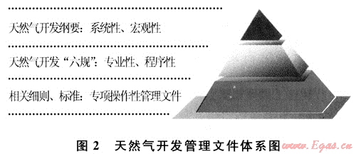 在借鑒國外天然氣開發(fā)理念和總結(jié)數(shù)十年開發(fā)經(jīng)驗(yàn)教訓(xùn)的基礎(chǔ)上,編制并頒布實(shí)施《天然氣開發(fā)管理綱要》,并構(gòu)建了以該《綱要》為主的3個(gè)層次天然氣開發(fā)管理文件體系(見圖2):①系統(tǒng)性、宏觀性的管理文件;②專業(yè)性、程序性的管理文件;③專項(xiàng)操作性的管理文件。管理文件體系的建立,對天然氣開發(fā)全過程提出明確要求,進(jìn)一步規(guī)范了天然氣開發(fā)各項(xiàng)管理工作,理順各專業(yè)管理工作界面和關(guān)系,明確了氣田開發(fā)各階段的主要工作內(nèi)容、程序和技術(shù)要求,形成不同層次管理人員和各環(huán)節(jié)現(xiàn)場操作人員操作程序與技術(shù)標(biāo)準(zhǔn)。天然氣開發(fā)全面實(shí)現(xiàn)制度化、科學(xué)化、全過程可控化管理。