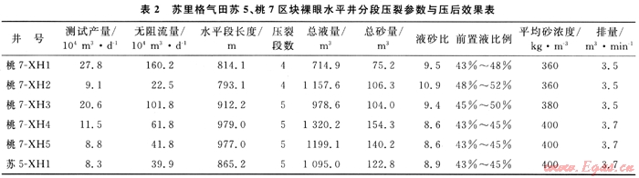 目前,蘇里格氣田蘇5、桃7區(qū)水平井分段壓裂共施工7口井,施工成功率100%,獲得平均測試產(chǎn)量14.8×104m3/d,平均無阻流量75.6×104m3/d,最高測試產(chǎn)量27.8×104m3/d,最高無阻力量160.2×104m3/d,具體設(shè)計(jì)及施工參數(shù)和壓后產(chǎn)量如表2所示。壓后效果證明筆者所建立的方法有效,結(jié)論正確,應(yīng)用效果良好。