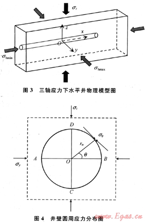 無限大地層水平鉆進(jìn)后在井壁周圍會產(chǎn)生應(yīng)力集中[2~3],其物理模型如圖3所示,并假設(shè)井筒方向與水平最小主應(yīng)力方向平行。