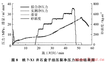 在待壓裂水平井壓裂參數(shù)設(shè)計(jì)前,先采用 FracproPT10.7軟件對鄰井已施工的同層位井壓裂曲線進(jìn)行精確凈壓力擬合,以桃7-X1井壓裂施工曲線擬合為例,擬合結(jié)果如圖8所示,獲取區(qū)域地應(yīng)力參數(shù)和巖石力學(xué)參數(shù):泊松比為0.22,彈性模量為1.2×104MPa,產(chǎn)層閉合壓力梯度為0.0126MPa/m,產(chǎn)層閉合壓力為41.4MPa,泥巖閉合壓力為46.92MPa,產(chǎn)、隔層應(yīng)力差為5.5MPa,區(qū)域破裂壓力梯度為0.018MPa/m,區(qū)域地層破裂壓力為59.0MPa。