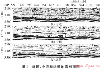 對3個(gè)數(shù)據(jù)體進(jìn)行頻譜分析,近道頻率范圍在4.32~80.37Hz之間,中道在4.32~64.24Hz之間,遠(yuǎn)道在4.77~60.77Hz之間,也就是說近道的剖面分辨率最高,中道次之,遠(yuǎn)道分辨率最低。在圖1中,可以看出近道剖面顯示出的細(xì)節(jié)性要比遠(yuǎn)道剖面清晰得多,中道好于遠(yuǎn)道而差于近道。