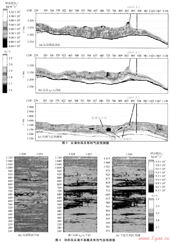 從反演結(jié)果(圖3-a,圖3-b,圖4-a,圖4-b)以及井曲線的敏感屬性分析可以得到,syb1井在目的層段的多種屬性基本上表現(xiàn)出不是良好的儲氣層段,而 syb1c1井的井底位置恰好在多種屬性分析上都表現(xiàn)出是良好的儲氣層段。這也直接驗(yàn)證了syb1井是低產(chǎn)井,而syb1c1井是一個(gè)高產(chǎn)氣井的客觀事實(shí)。對于本區(qū)含氣儲層段,橫波阻抗和vp/vs屬性是檢測氣藏非常好的2個(gè)參數(shù),因此,選擇橫波阻抗和vp/vs屬性體進(jìn)行有利氣層預(yù)測。圖3-c和圖4-c是有利氣層預(yù)測的過井剖面圖及目的層平面上有利氣層預(yù)測圖。
