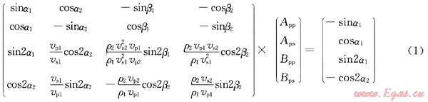 式中α為縱波入射角;α1為縱波反射角;α2為橫波反射角;β1為縱波透射角;β2為橫波透射角;ρi為第i種介質(zhì)的密度;vpi為第i種介質(zhì)的縱波速度;vsi為第i種介質(zhì)的橫波速度;App為縱波位移反射系數(shù);Aps為橫波位移反射系數(shù);Bpp為縱波位移透射系數(shù);Bps為橫波位移透射系數(shù)。