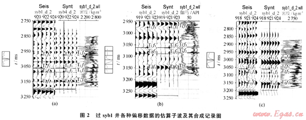 對于近道、中道和遠(yuǎn)道數(shù)據(jù)體分別提取了子波,經(jīng)過多次子波估算,最后得到了比較理想的子波以及由估算的子波制作的合成記錄。圖2-a是過syb1井的近道數(shù)據(jù)的估算子波及其合成記錄,圖2-b是過syb1井的中道數(shù)據(jù)的估算子波及其合成記錄,圖2-c是過 syb1井的遠(yuǎn)道數(shù)據(jù)的估算子波及其合成記錄。
