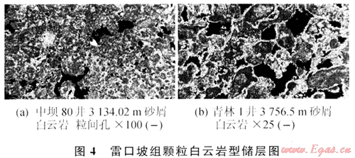 從LG地區(qū)及川中地區(qū)鉆探情況看,構(gòu)成該類儲(chǔ)層的巖性主要是顆粒白云巖、細(xì)粉晶白云巖和含膏??啄嗑О自茙r,其中以顆粒白云巖最好。儲(chǔ)集空間有粒內(nèi)和粒間溶孔、晶間溶孔和膏模孔及微裂縫,如圖3所示。