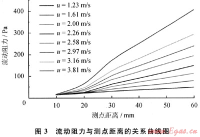 由式(1)可以看出,阻力應(yīng)該與距離成正比。分析造成上述實驗現(xiàn)象的原因是:實驗中放置泡沫陶瓷的鋼管與高壓氮氣瓶連接需要變徑,氣流在異徑處附近的流速分布不是充分發(fā)展紊流,流速分布不對稱,有畸變,還可能有漩渦、回流,在測點處的流速偏小,曲線向速度較低的曲線靠近,形成了圖3中與測點A的距離小于30mm時的流動阻力形態(tài)。因此,在以下分析中,僅對測點距離大于30mm的數(shù)據(jù)進行分析,即對測點距離小于30mmm的泡沫陶瓷流動進行調(diào)整,以此來消除異徑對測量結(jié)果的影響。