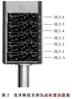 圖2為泡沫陶瓷及壓力測定點布置示意圖。用軟質(zhì)材料包裹泡沫陶瓷,放置在鋼管中,保證泡沫陶瓷周邊與鋼管內(nèi)表面的密封;在鋼管側(cè)面開有7個測壓孔,其間距為10mm。實驗中對測點A與其他6個測點的壓力差用數(shù)字微壓差計進行8次測量,取平均值;空截面風(fēng)速由畢托管在實驗段出口處的不同位置也進行8次測量,取其平均值。實驗所采用的泡沫陶瓷規(guī)格為50mm×50mm×20mm,PPI分別為10、20、30,空隙率為88%。