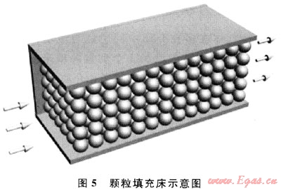 氣流在多孔介質(zhì)中的流動阻力主要是由流體質(zhì)點間存在相互牽制作用、流體與多孔介質(zhì)的表面摩擦造成的。圖5為顆粒填充床示意圖。對于氣流在顆粒填充床與泡沫陶瓷中的流動,若兩者的比表面積及空隙率相等,可認(rèn)為兩者的流動阻力是近似相等的。