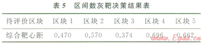 投影長度(xij*)記為綜合靶心距。綜合靶心距計算結(jié)果如表5所示。由區(qū)間數(shù)灰靶決策模型得到的結(jié)果為:x*=min(xij*)=0.374。該結(jié)果對應(yīng)的足區(qū)塊3。因此,區(qū)塊3為資源勘探開發(fā)潛力評價最優(yōu)區(qū)塊。