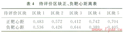 5個待評價區(qū)塊向量距離正、負(fù)靶心之間的距離如表4所示。