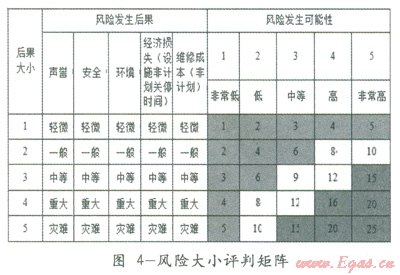 管道的風(fēng)險評價可使用定性、半定量或定量的方法進(jìn)行。設(shè)計數(shù)據(jù)、管道運行數(shù)據(jù)及檢測數(shù)據(jù)等應(yīng)作為評估的基礎(chǔ)數(shù)據(jù)。風(fēng)險評價是進(jìn)行檢測、監(jiān)控和完整性管理的基礎(chǔ)。因此,對管道進(jìn)行風(fēng)險狀況評價后必須進(jìn)行風(fēng)險等級劃分。即完成運行期管道風(fēng)險狀況評估后,給出一個風(fēng)險劃分的標(biāo)準(zhǔn),把不同風(fēng)險狀況的管道進(jìn)行歸類。